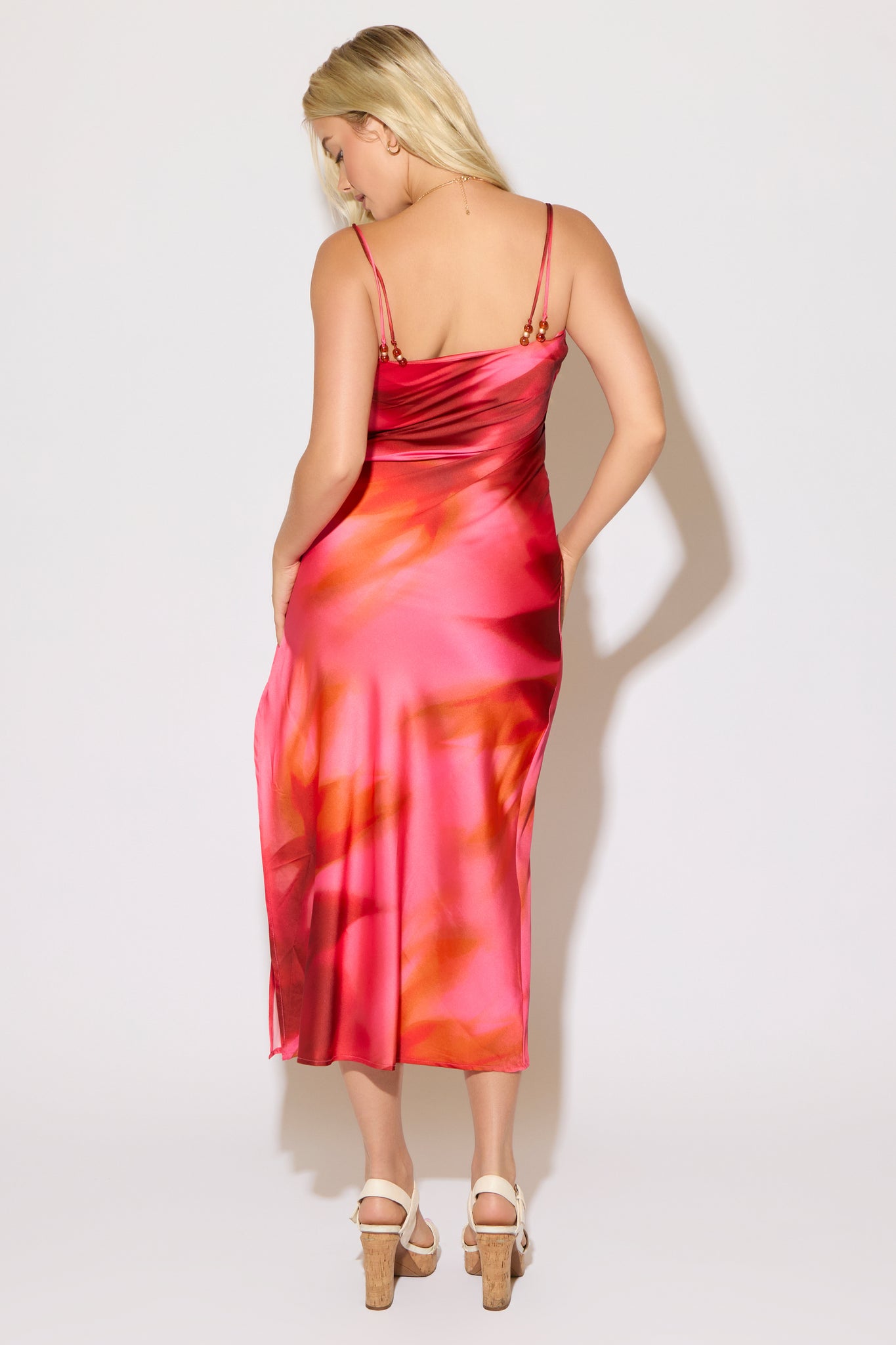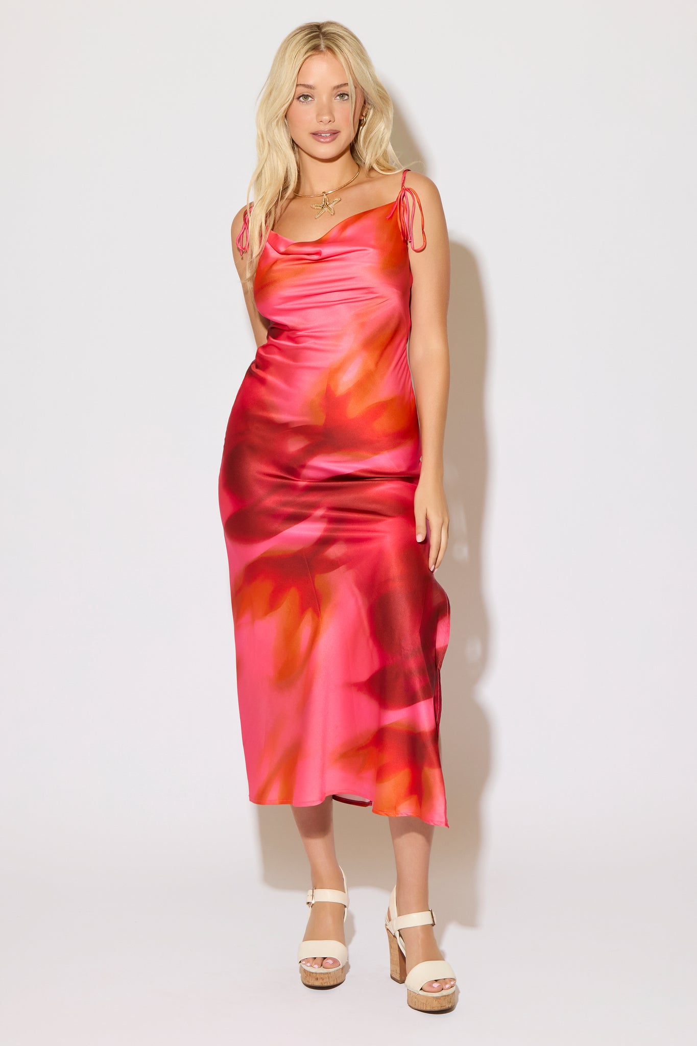 Elegant, flowy, and effortlessly chic, the Tie Strap Cowl Neck Printed Satin Maxi Dress is perfect for making a statement at any event. Crafted in smooth satin with a flattering cowl neckline, this maxi dress features delicate tie straps and a bold printed design for a feminine, modern look. The floor-grazing length and lightweight fabric create a soft, flowing silhouette that moves beautifully with every step.