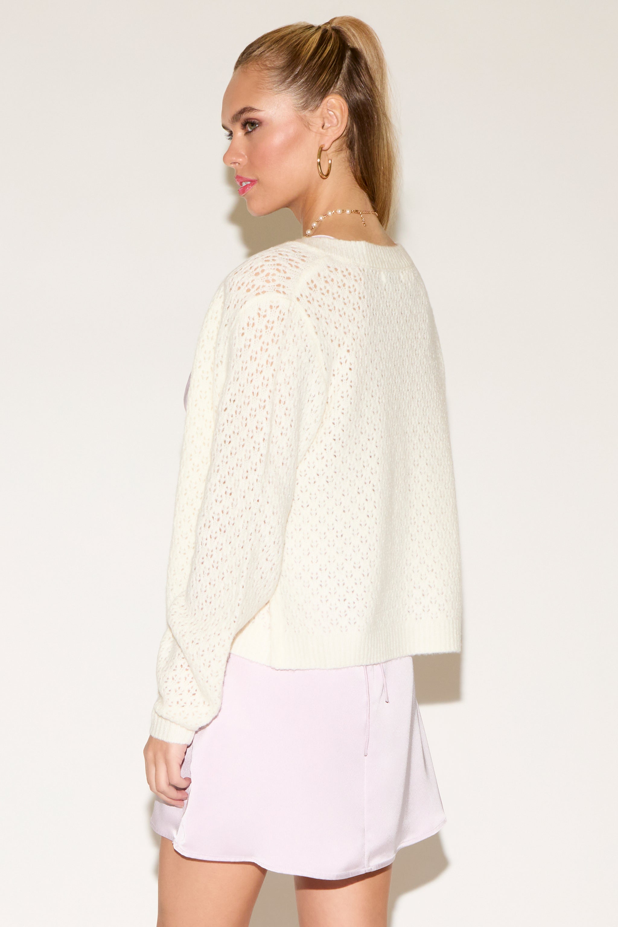 Lightweight and effortlessly chic, this open eyelet knit button-up cardigan is the perfect layering piece for any season. Designed with a breathable knit and delicate eyelet detailing, it adds subtle texture while keeping your look airy and polished. The classic button-front silhouette makes it easy to wear on its own or layered over tanks and dresses. Style it with denim for everyday ease or pair it with a mini skirt for a soft, feminine vibe. A versatile must-have that blends cozy comfort with elevated style.