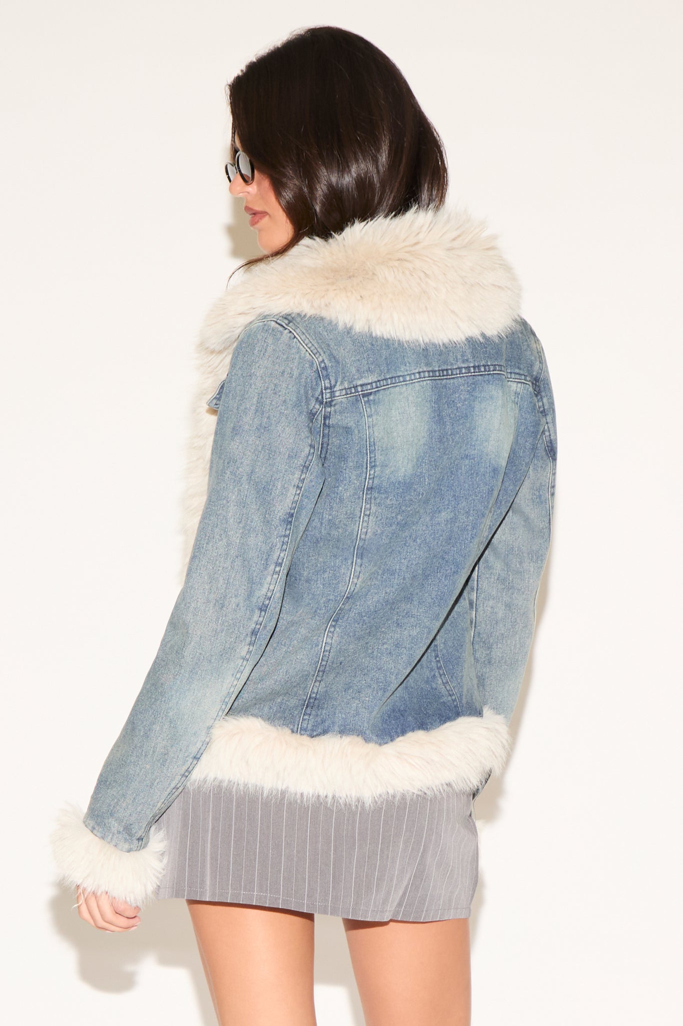 Turn up the cozy-cool factor with this faux fur trim denim jacket with front pockets. Featuring soft fur accents on the collar and cuffs, it blends classic denim style with a luxe winter twist. The front pocket detail adds function and flair, making it the perfect layering piece for casual or streetwear looks.