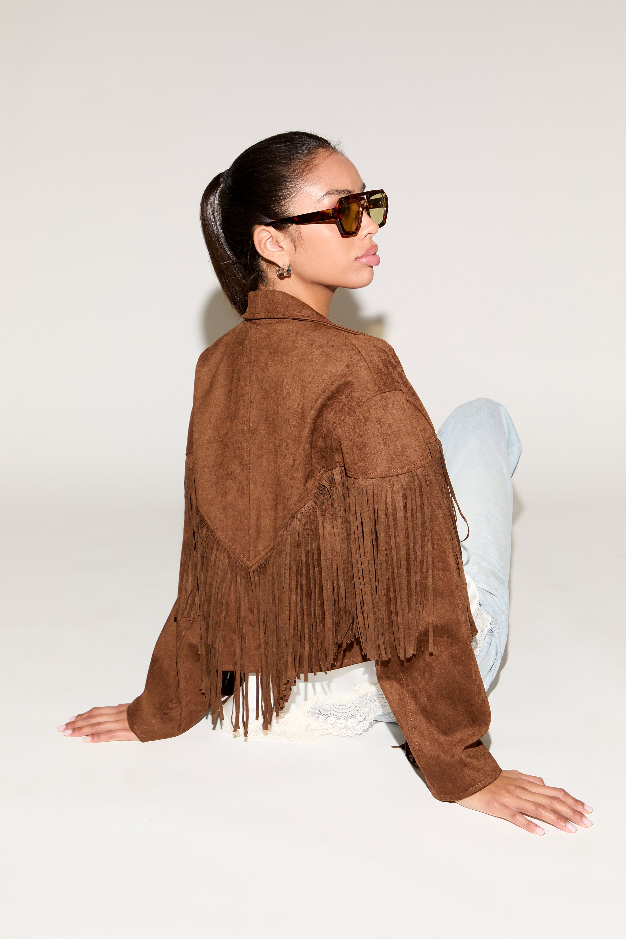 Add a touch of Western-inspired edge to your wardrobe with this fringe detail vegan suede jacket. Designed with classic lapels and soft, premium-feel faux suede, it delivers both structure and movement for an elevated statement look. The cascading fringe adds playful texture, making it perfect for festivals, nights out, or adding personality to everyday outfits. Layer it over basics, dresses, or denim for an easy, trend-forward finish.