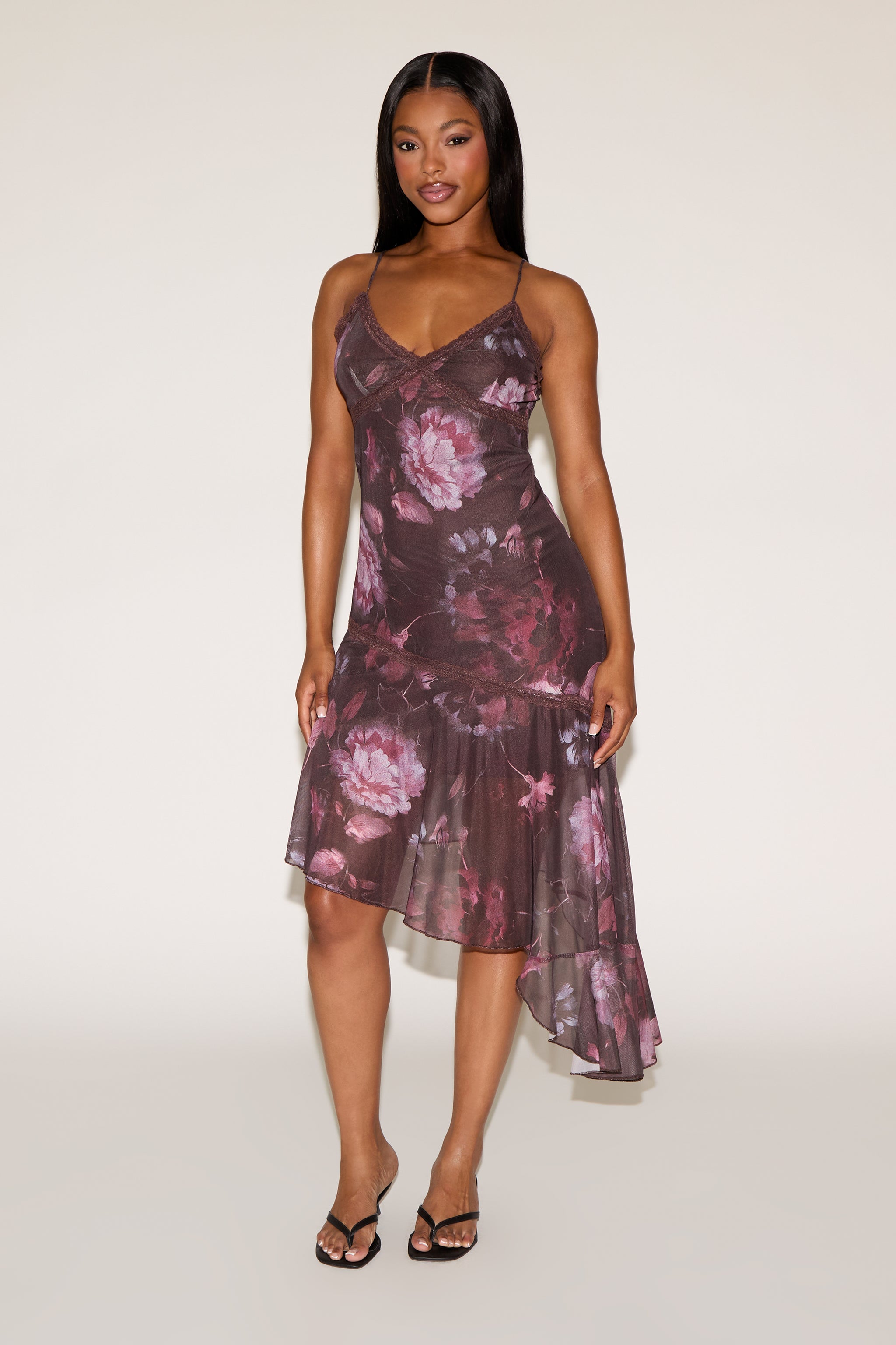 Bloom with confidence in this Rose Print Asymmetric Ruffle Hem Sleeveless Mini Dress. Featuring a romantic rose print, playful asymmetric ruffle hem, and a sleeveless silhouette, this mini dress is perfect for parties, date nights, or any occasion where you want to stand out.