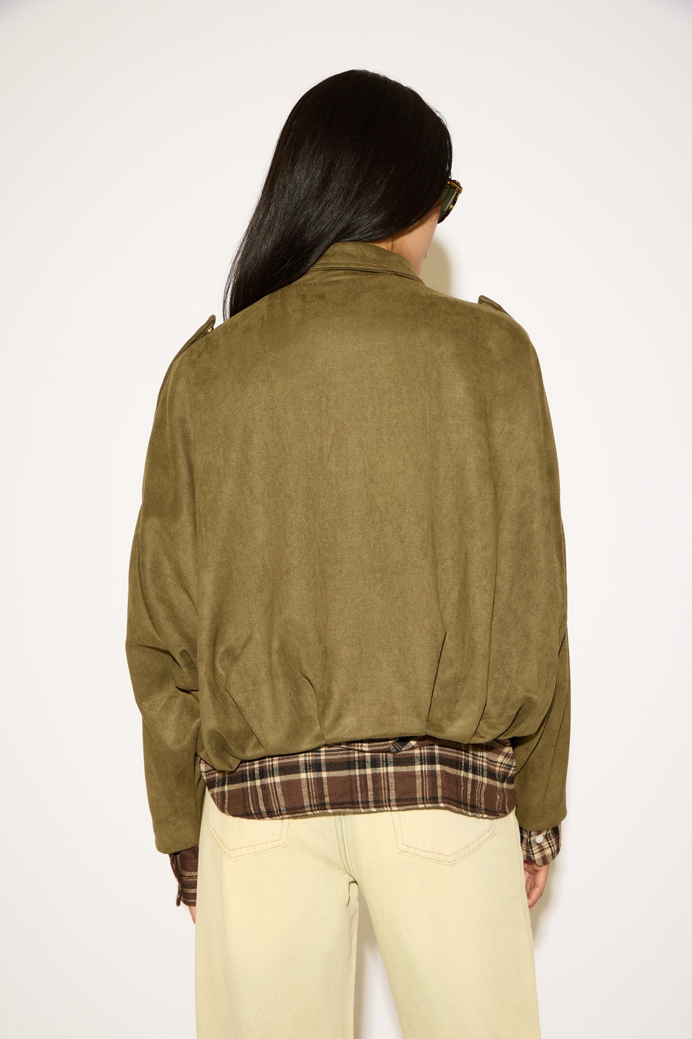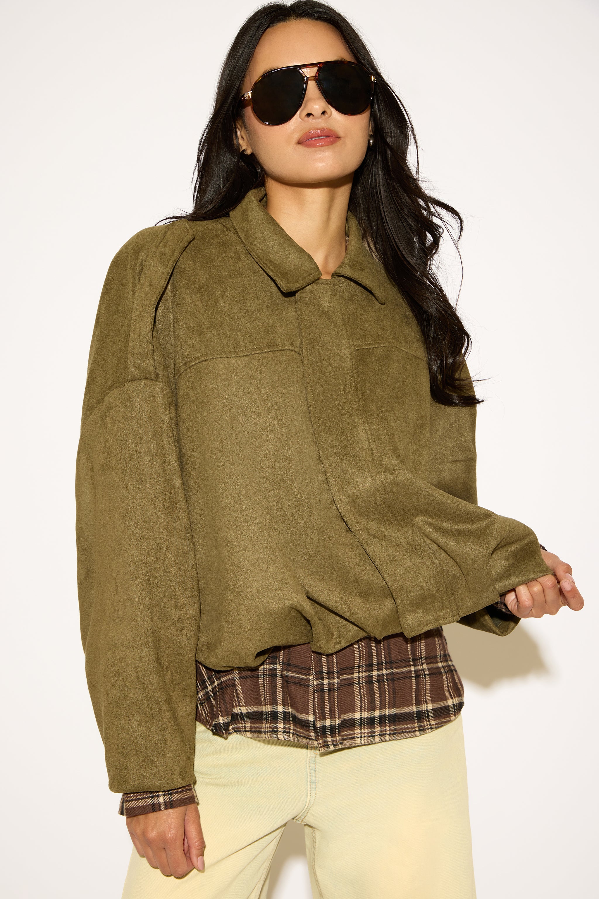 Elevate your outerwear with this ruched bottom vegan suede collared jacket. Crafted from soft faux suede, it features a structured collar and cinched hem for a flattering fit. Perfect for layering, this jacket adds a chic touch to both casual and dressy looks.