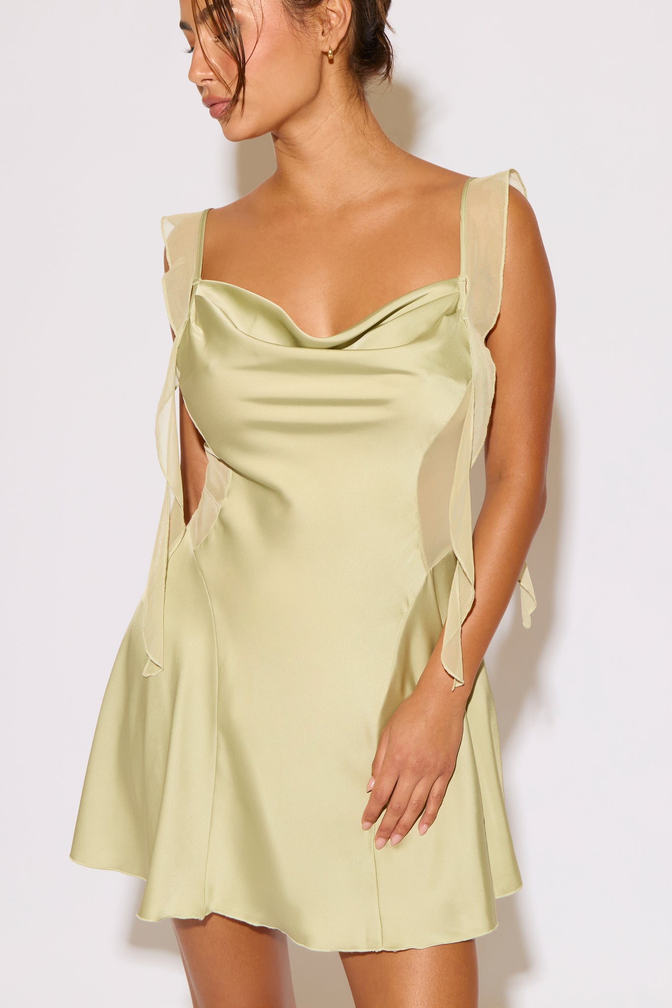 Soft, sultry, and made to be seen. This ruffle shoulder cowl neck satin mini dress is giving main-character energy in the best way. Designed in a glossy satin that catches the light just right, it features a draped cowl neckline, a statement ruffle shoulder, and sheer mesh side panels that contour your shape for an ultra-sexy, snatched look.