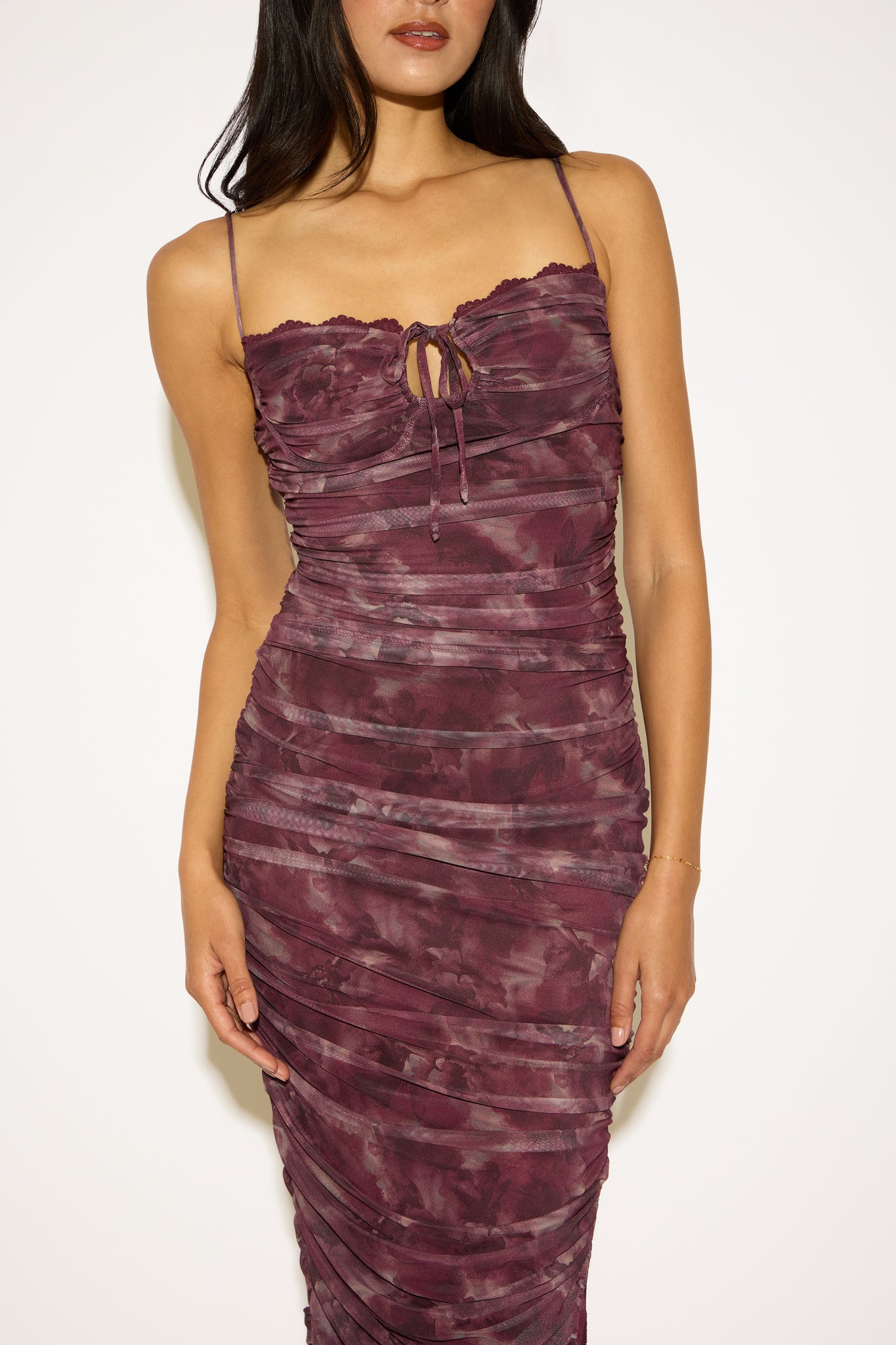 This sleeveless ruched mesh midi dress features a flattering side slit and body-hugging silhouette. The printed mesh overlay adds a touch of elegance and texture, making it perfect for both day-to-night styling. A chic choice for parties, dinners, or special occasions