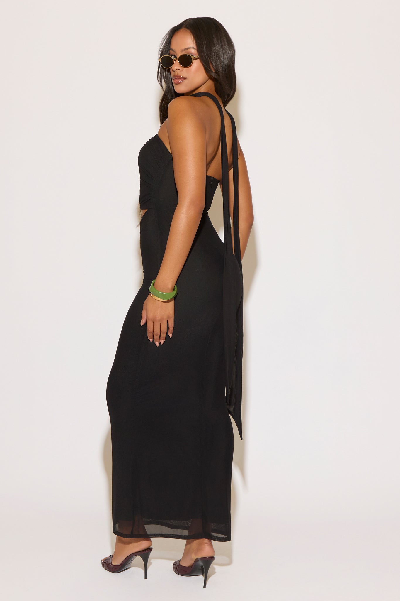 A sleek, figure-skimming mesh maxi with a strapless neckline and bold cutout detailing. Sheer, lightweight, and effortlessly sexy—perfect for nights out, festivals, or a standout event look. Style with heels and statement jewelry for maximum impact.