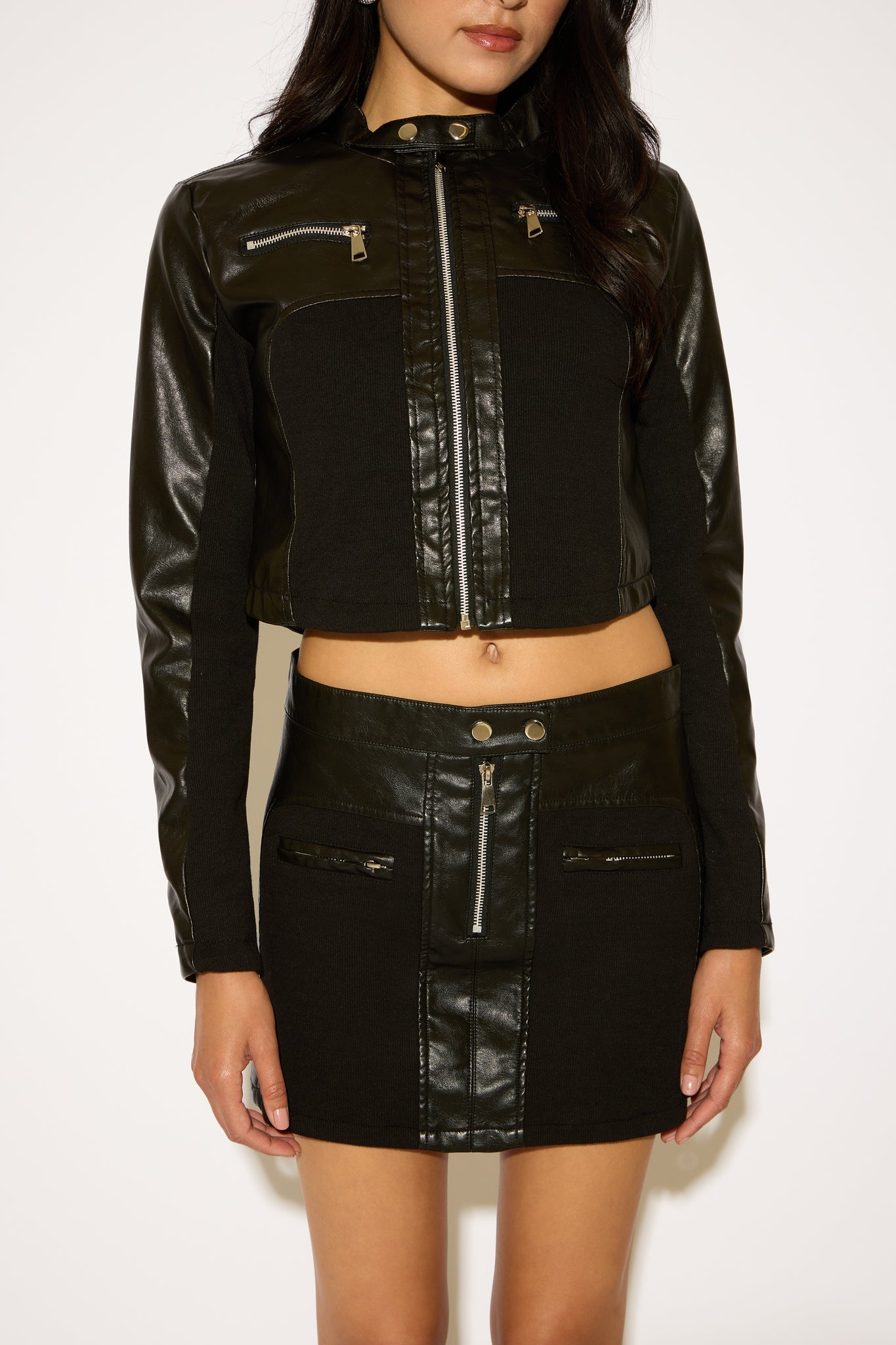 Edgy and modern, this vegan leather cropped moto jacket features bold panel details and a sleek zip up front. Designed with a flattering cropped fit, it adds instant attitude to any outfit. Pair it with denim, skirts, or dresses for the perfect mix of streetwear and chic.