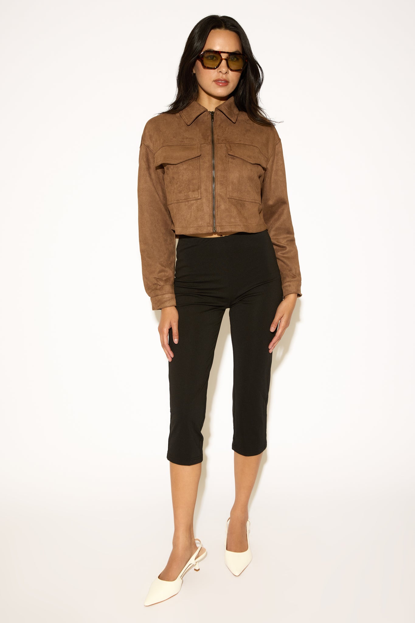 ZIP UP CROPPED VEGAN SUEDE COAT WITH PATCH POCKETS